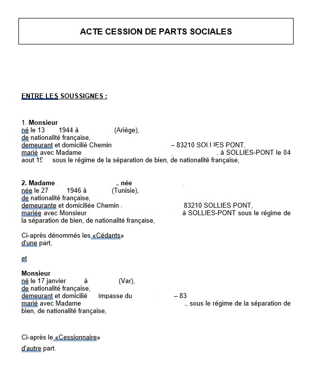 AVOCAT CESSION A TOULON : NOUVELLE OPERATION DE CESSION DE PARTS D'UNE SARL